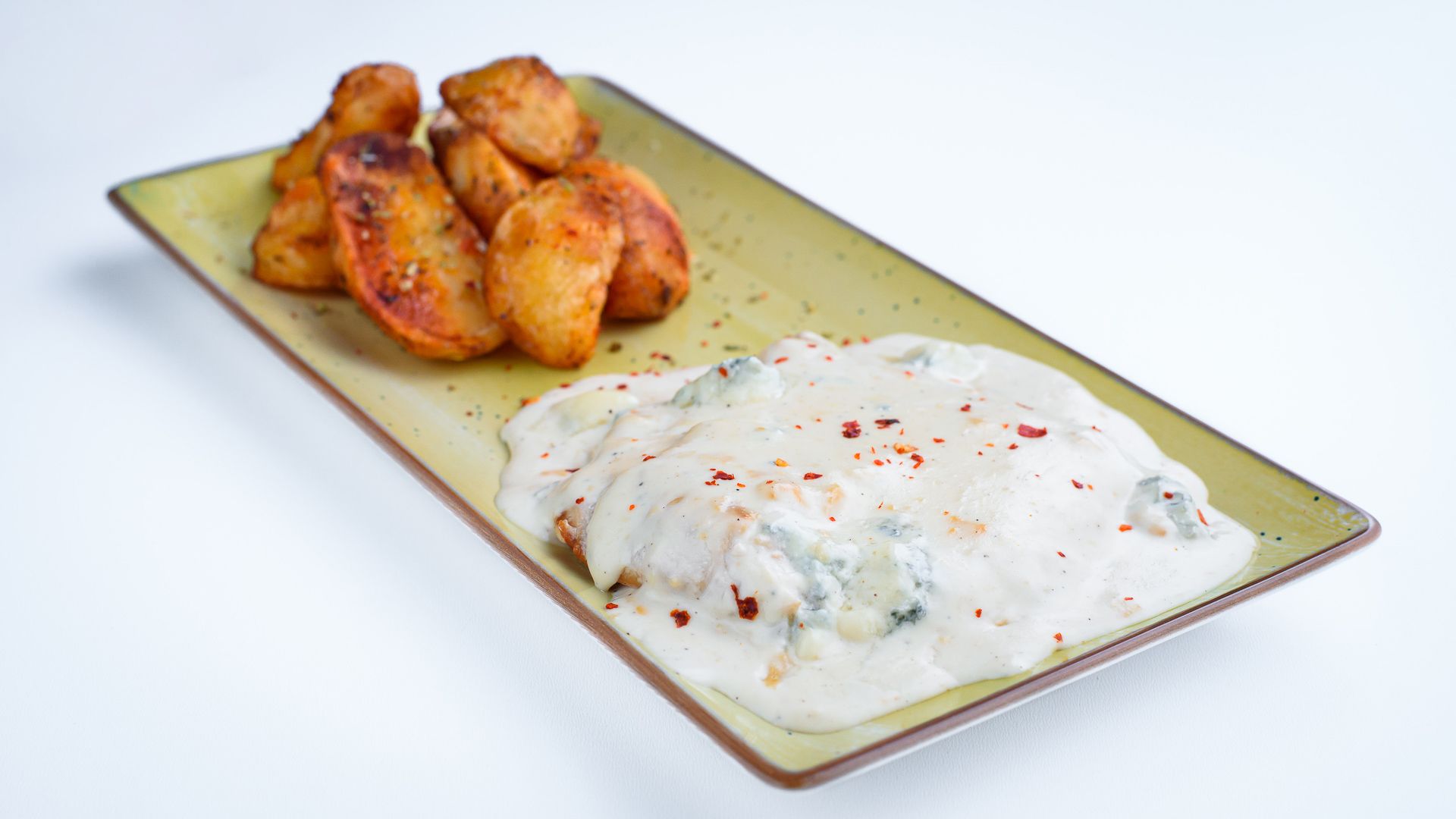 Piept de pui cu sos gorgonzola si cartofi la cuptor