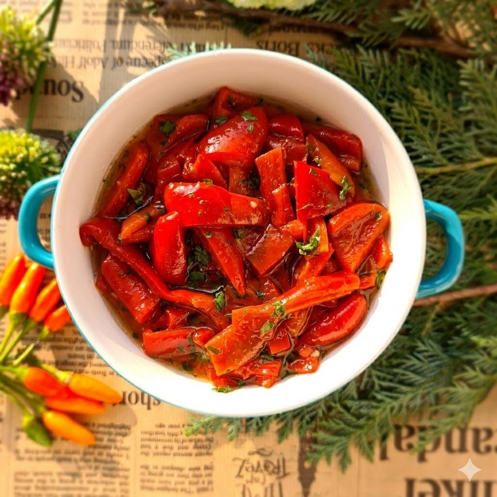 Ingrediente:Vinete -300g (), Ardei capia -70g (), Rosii -40g (), Ulei floarea soarelui -10g (), Sare de masa -3g (),Piper negru -2g ()